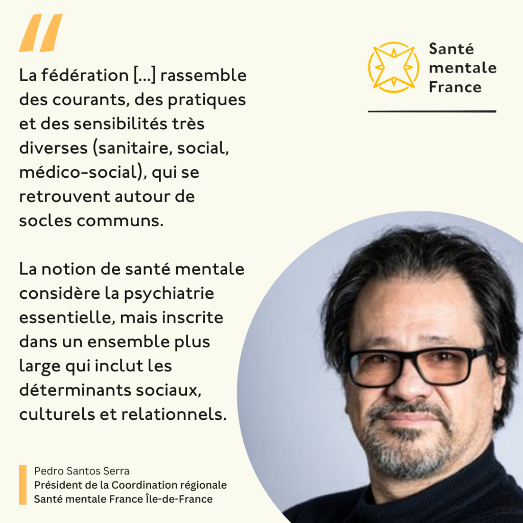Pedro Santos Serra : La première force de Santé mentale France réside dans le mot même de « fédération ». Elle rassemble des courants, des pratiques et des sensibilités très diverses (sanitaire, social, médico-social), qui se retrouvent autour de socles communs.