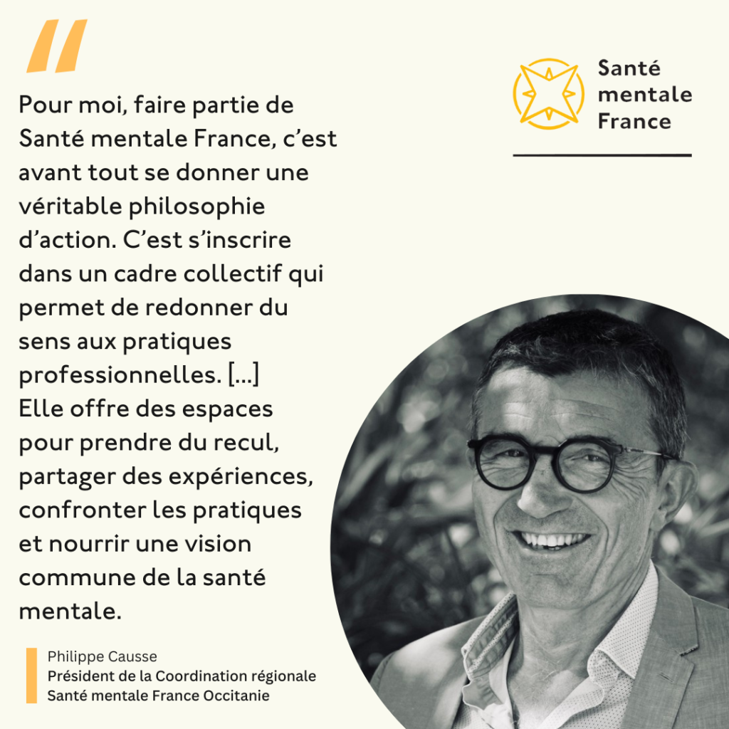 Philippe Causse : Pour moi, faire partie de Santé mentale France, c’est avant tout se donner une véritable philosophie d’action. C’est s’inscrire dans un cadre collectif qui permet de redonner du sens aux pratiques professionnelles, à un moment où ce sens est parfois fragilisé.