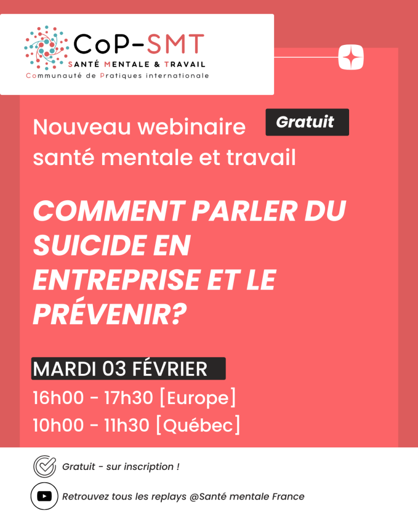 🔍 La CoP-SMT (Communauté de Pratiques Internationale Santé Mentale et Travail) réunit des professionnels du soin et de l’accompagnement, des chercheurs, des personnes concernées par les troubles psychiques, ainsi que des salariés et des employeurs. Son objectif est de promouvoir les échanges et de diffuser les bonnes pratiques pour améliorer la santé mentale de tous les travailleurs.