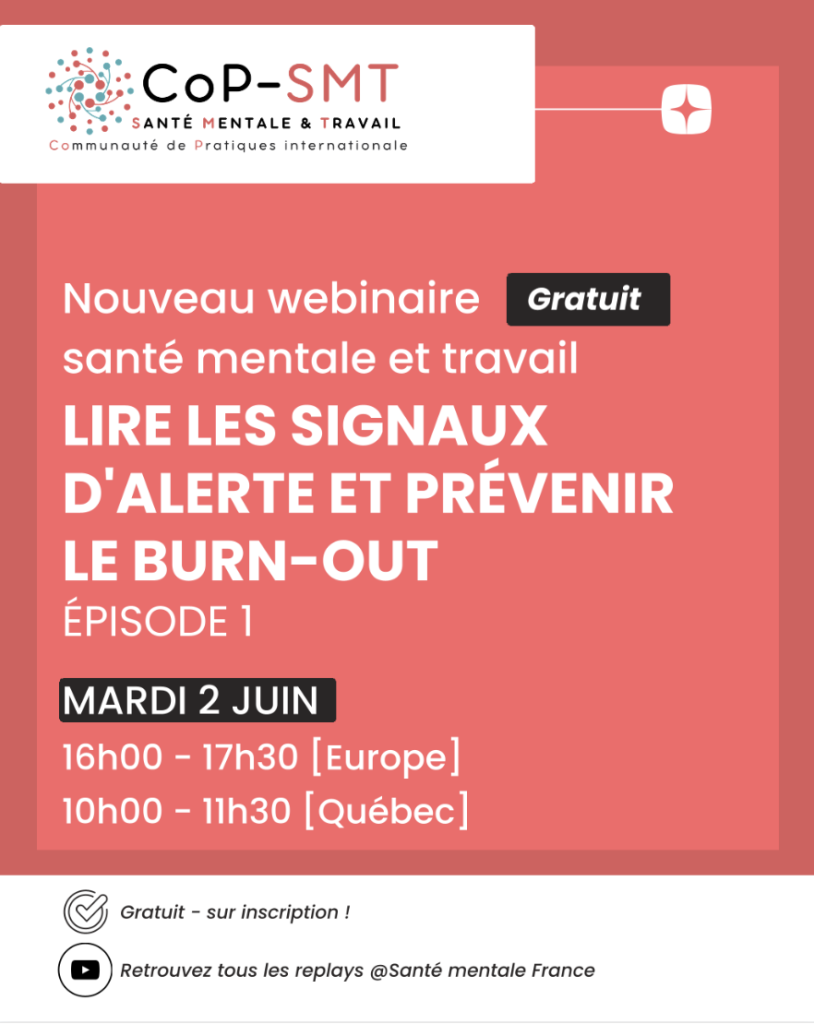 🔍 La CoP-SMT (Communauté de Pratiques Internationale Santé Mentale et Travail) réunit des professionnels du soin et de l’accompagnement, des chercheurs, des personnes concernées par les troubles psychiques, ainsi que des salariés et des employeurs. Son objectif est de promouvoir les échanges et de diffuser les bonnes pratiques pour améliorer la santé mentale de tous les travailleurs.